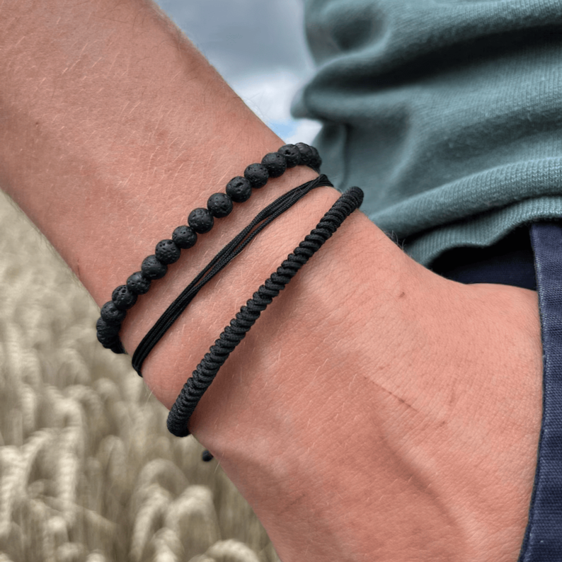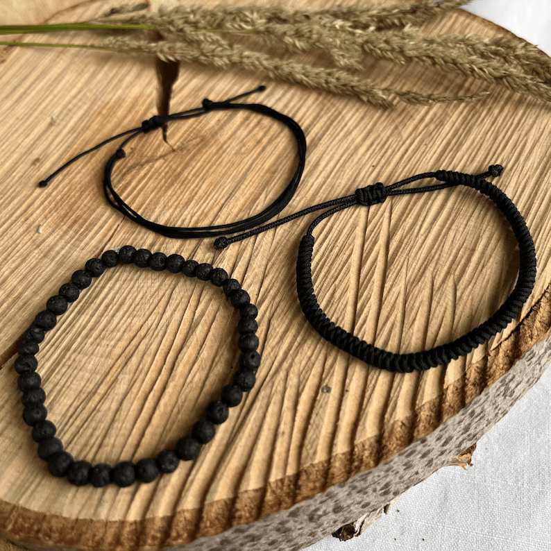 Os conjuntos incluem uma pulseira de nó da sorte, uma pulseira de miçangas e uma pulseira de corda.